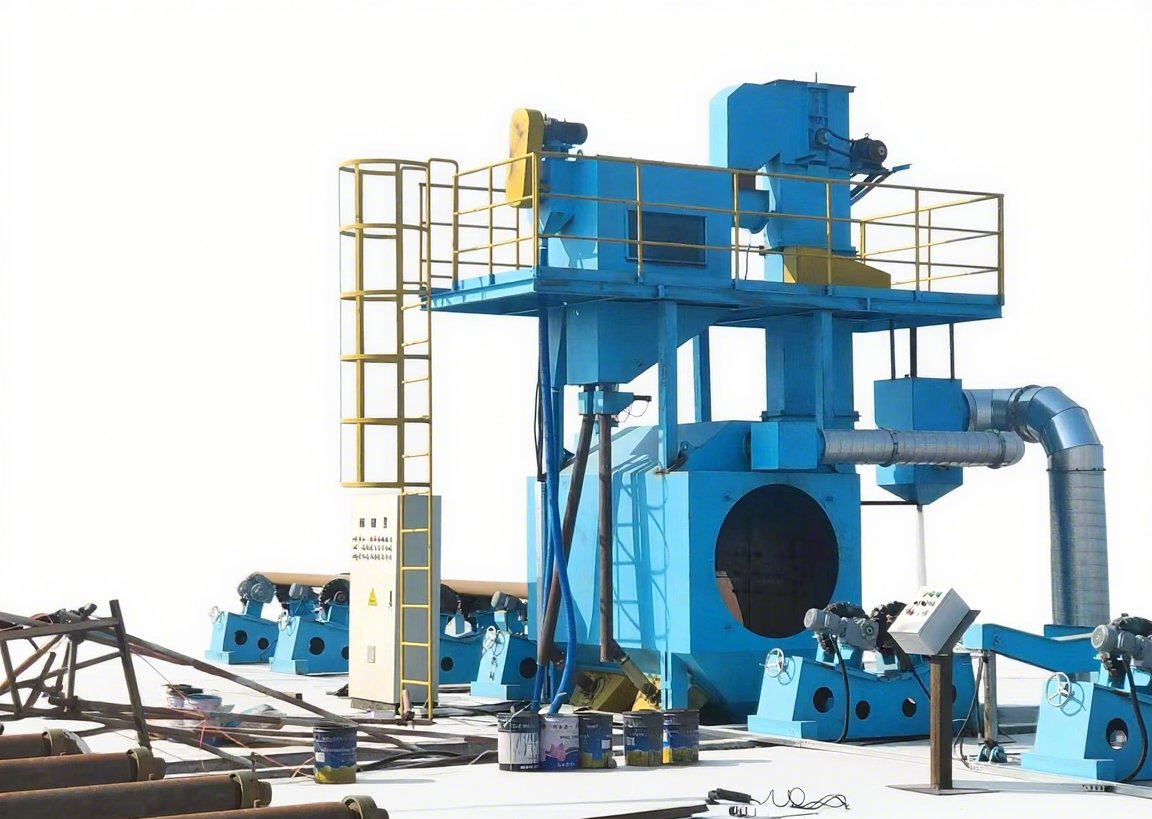 Данная машина предназначена для: непрерывной дробеструйной обработки наружной поверхности партий стальных труб перед сваркой или покраской, а также для тщательного удаления ржавчины, окалины и других загрязнений. Это эксперт в очистке трубопроводов. После дробеструйной обработки получается гладкая поверхность с определенной степенью шероховатости, что увеличивает адгезию распыления, улучшает качество поверхности и антикоррозионный эффект.