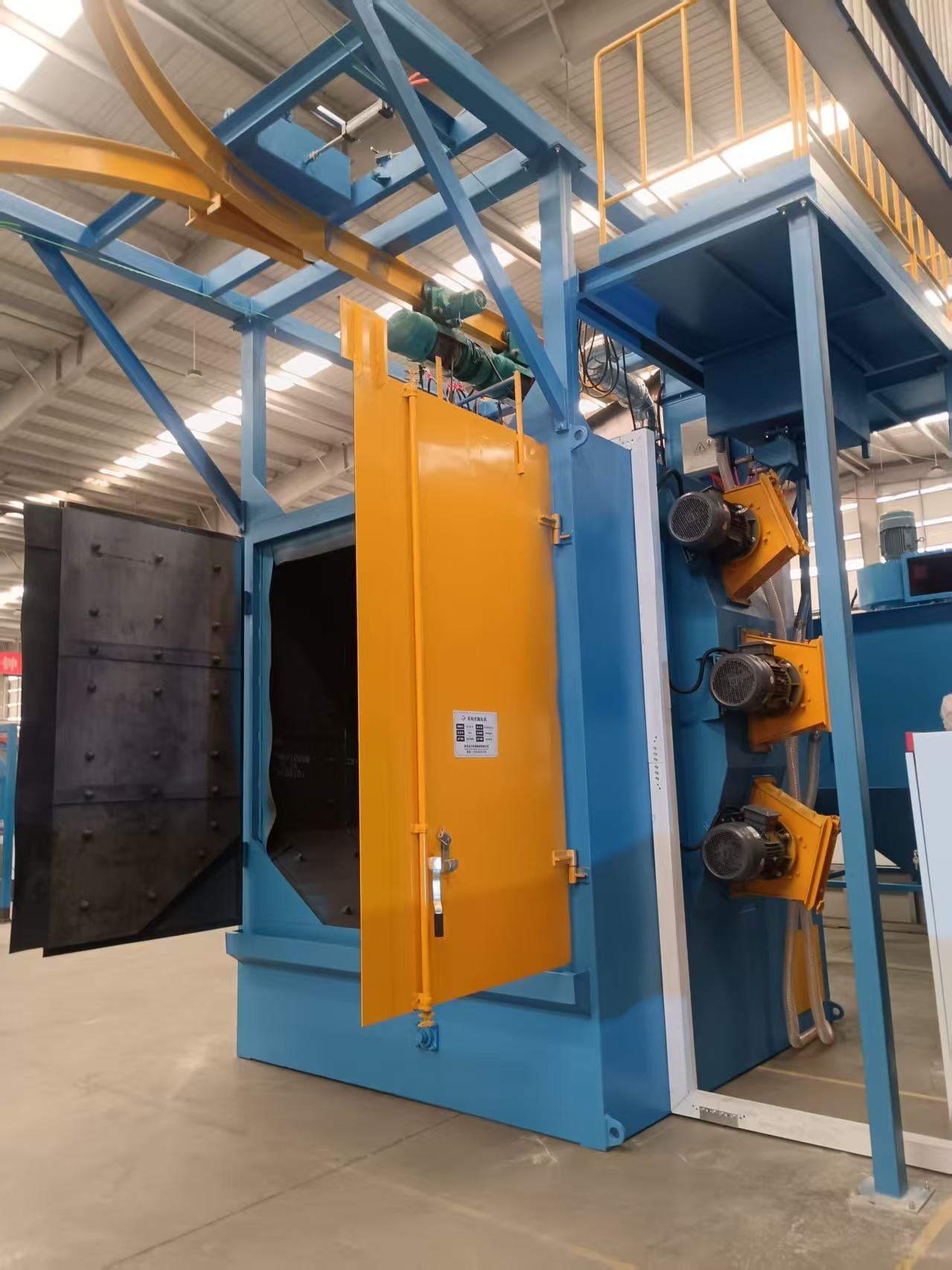 Расположение дробеструйной камеры и дробеструйных аппаратов определяется после компьютерной трехмерной динамической симуляции траектории движения абразива. Дробеструйные аппараты с высокой скоростью проектирования абразива позволяют значительно повысить эффективность очистки и получить удовлетворительное качество обработки. В качестве разделительного устройства используется высококачественный барабанный сепаратор абразива и шлака с полным занавесным потоком, который обеспечивает значительное улучшение разделительного эффекта. Для открытия и закрытия применяются пневматические ворота с хорошей герметичностью и плавным ходом. Крановый крюк оснащен функциями автоматического подъема, перемещения и вращения вокруг собственной оси. Система удаления пыли представляет собой двухуровневую фильтрационную систему, состоящую из гравитационного пылеулавливателя и фильтровального пылеулавливателя типа LT24. Концентрация выбросов не превышает 50 мг/м³.